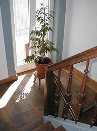 Blick auf die restaurierte Stockwerkstreppe des ehemaligen Schulhauses.