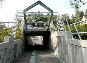 Die an sich enge Röhre wird stark aufgeweitet durch das filigrane Rahmenwerk. Die Decke der Unterführung wird gleichsam in den davor liegenden Raum gezogen und transparent auflöst.