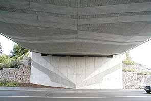 Durch den fischbauchartig abgerundeten Querschnitt wirkt der Überbau der Brücke leicht. Seine plastische Form wird durch die Schalungsstruktur im Kontrast zwischen glatten und rauhen Flächen erst richtig sichtbar.