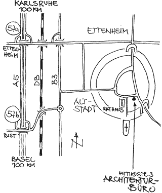 A5 Ausfahrt 57a Ettenheim – L103 Richtung Ettenheim (Schwarzwald) – über die B3 - nach Ortsschild „Ettenheim“ 2. Kreuzung Richtung Altstadt, Information/Rathaus – durch „Unteres Tor“ – beim Abzweig am Nepomukbrunnen links in Friedrichstraße bleiben – nächste Straße rechts in Ettikostraße – 3.Haus auf der linken Straßenseite: Architekturbüro |