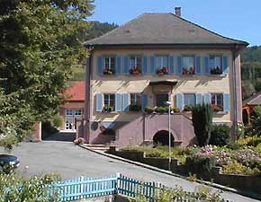 Pfarrhaus mit dem Hofeingang (rechts). Hinten erkennbar die westliche Scheune.