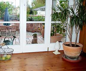 Blick in den abgeschirmten Freisitz im Garten. Hierhin erweitert sich der Familienraum bei den vielen schönen Sonnentagen in Ettenheim.