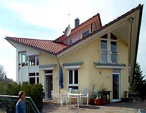 Terrasse über Garagendach. Vorbau-Rolladen bilden kleine Überdachungen für die darunter liegenden Fenster.