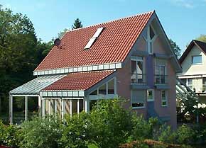 Traditioneller Baukörper mit seitlich pultdachförmig angesetzten Ergänzungen: wintergartenartige Erweiterung des Wohnraums und Terrassenüberdachung auf Südseite.