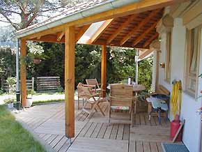 Überdachte Terrasse am Küchenausgang auf der Ostseite des Erdgeschosses.